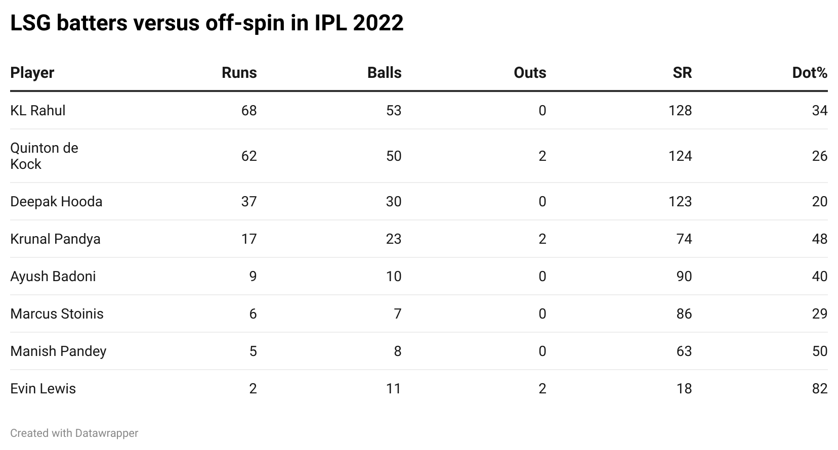 None of their right-hand batters have managed to dominate finger-spin this season, and it’s largely been a major struggle for their left-hand bats. Quinton de Kock has still fared alright, but off-spin has been the nemesis of Krunal Pandya, who’s struck at 73.9 while being dismissed twice. Throw in Evin Lewis, who is expected to play the Eliminator and has fared even worse than Krunal against off-spinners this season, Wednesday could be a potential feast for Maxwell should LSG not be careful.