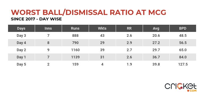 In the last four years, England have the worst balls per wicket ratio at the MCG in 2017 on Day three as they lost 43 wickets on the third day with a ball per wicket ratio of 48.5, the worst for them across five days at the venue.
