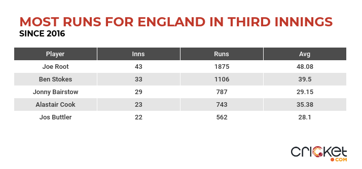 Despite their struggle in the last hour of the session, England can take solace from their record in the third innings since 2016. The Three Lions have four players on the list of leading run-scorers for the side in the longest format of the game in the last five years.