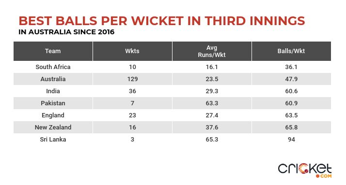 The bowling unit of the Australian side have a sublime record in the third innings at home since 2016 as they have scalped a wicket every 47.9 balls, which is the second-best among all the teams.