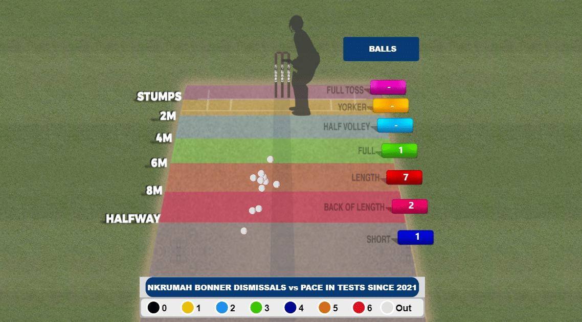 -In Tests since 2021, Nkrumah Bonner averages 16.9 against pacers (7 dismissals) when bowled on good length. However, when bowled full, he averages 92, and averages 66.5 and 40 when bowled on back of a length and short.
