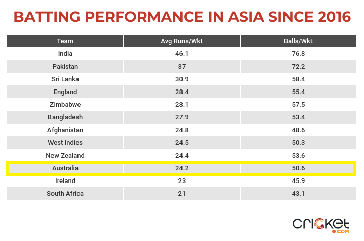 Overall, outside Australia, the numbers don’t look particularly good. But the Aussie batters have been even worse in Asian conditions. Since 2016, Australia have played 11 Tests in Asia - 9 in the sub-continent and 2 in the Middle-East - and in those games, they’ve averaged 24.2.