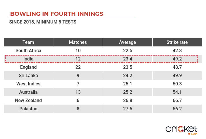 On the other hand, England will be facing a strong unit of bowlers. If England have been the second-best batters in the fourth innings, India have been the second-best bowlers in the aforementioned time. Indian bowlers have bagged wickets every 23.4 runs at a strike rate of 49.2. Their runs per wicket ratio is the second-best among teams that have played five-plus matches.