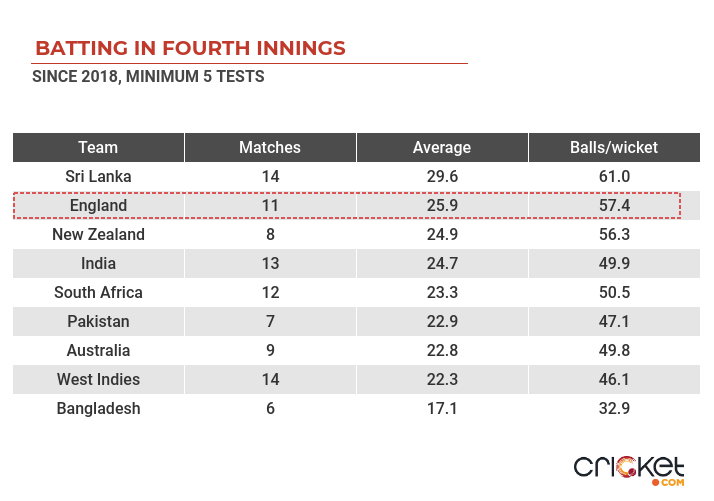 The current England team have some exceptional second innings players like Dom Sibley, who averages way better in the second innings than first. The in-form Joe Root is the biggest threat. Jos Buttler and Rory Burns also have decent averages in the fourth innings. In reality, England batsmen have been very good in the fourth innings. Their average of 25.9 is the second-best among teams that have batted in five or more matches in Tests since 2018.