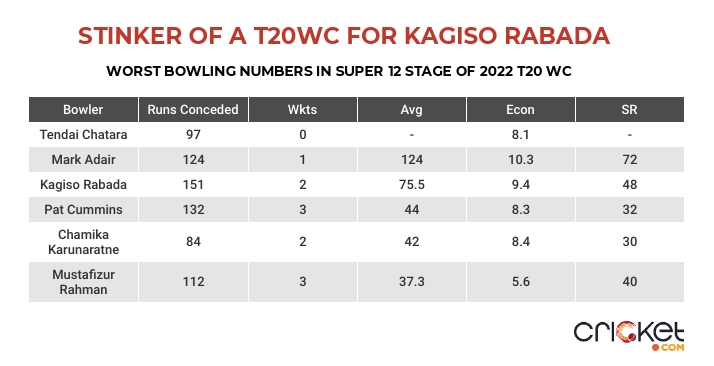 Afif Hossain and Iftikhar Ahmed. Without context, it might really look like important wickets. Rabada picked up Afif’s wicket in the sixth over of the innings after Bangladesh were already stuttering at 39/3. In Iftikhar’s case, his wicket came late in the innings - the 20th over. As vanilla as it is, the Protea pacer had a stinker of a tournament.