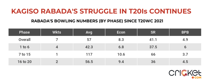 Having said that, Rabada has been blowing hot and cold for some time now. It was first noticed in last year’s IPL, where he averaged 30 in the powerplay. Since last year’s T20 World Cup, South Africa’s talisman pacer has been in dismal form across phases, and some of the numbers from there are beyond explanation.