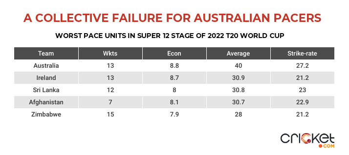 Australia had the worst pace unit in this year’s T20 World Cup. By worst, we rest assure it is the worst, with an average of 40. There is a sea of difference between them and the second worst pace-unit – Ireland – who have an average of 30.9.
