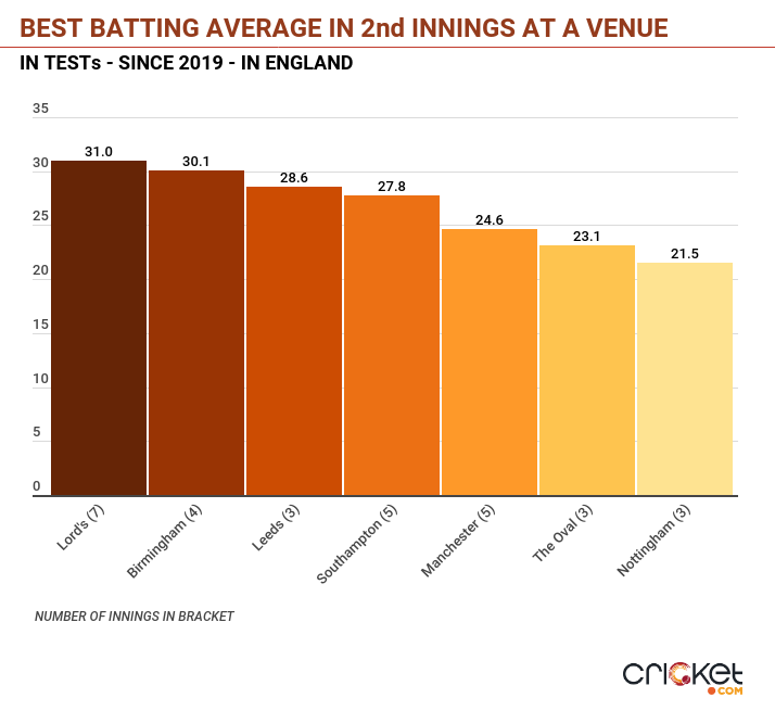 When England have batted first, they have averaged 31.6 and have lost a wicket every 58.7 balls. In contrast, in the six innings they have batted second, they have averaged 24.9 and lost wickets every 53.9 balls. Among all teams, only Zimbabwe (20.3) and West Indies (20.4) have a poorer second innings average at home in Test since 2019.