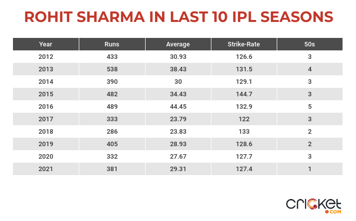 It has been a while since the Mumbai skipper Rohit Sharma justified his potential with the bat. The last time he averaged above 30 in an IPL season was in 2016. His best strike-rate in a season during this period lingers at 133.