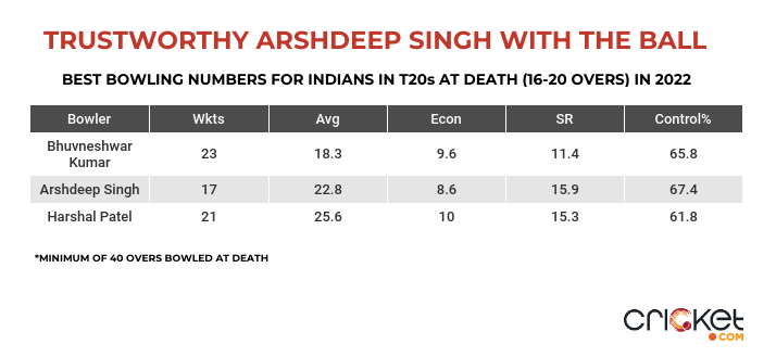 Among Indian pacers with a minimum of 40 overs at the death since January 2021, Arshdeep is only behind Bhuvneshwar in terms of average. If economy rate is your concern, the left-arm pacer has been India’s best bowler since the start of the year.