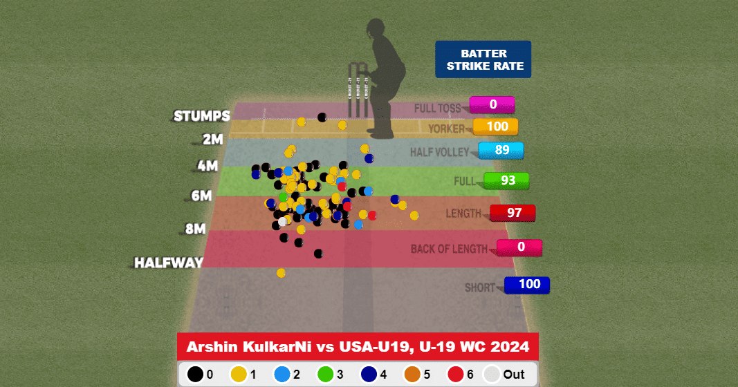 Hence, his strike rate against deliveries hitting the wickets was 150, where he allowed his bottom hand to dominate against the spinners (especially against the USA skipper Rishi Ramesh), showing that he’s an elite hitter of the cricket ball. If any doubts were left, he swept pacer Arya Garg over deep square leg for a humongous six to settle them.