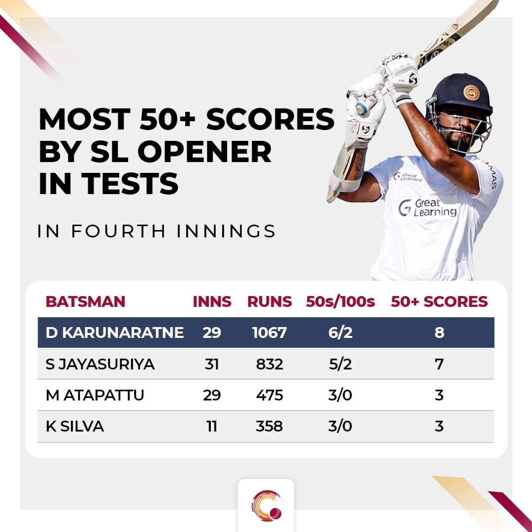 Karunaratne with his pinpoint foot-work, was able to counter the spin trio of India. There were some balls that went past the outside edge, but on that minefield, it is expectable. When he reached his half-century, Karunaratne registered his eighth 50+ score in the fourth innings, which is the most for a Sri Lankan opener.