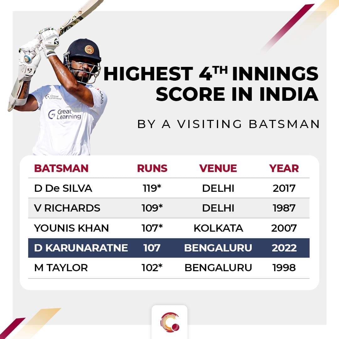 Despite losing wickets at the other end, Karunaratne wasn’t hampered by it. He converted his 50 into a century and registered the first ton of this match, which looked impossible for a batsman. His century was only the fifth by a visiting batsman in the fourth innings in India. On course to his century, he also became the third Sri Lankan batsman after Kumar Sangakkara (1163) and Mahela Jayawardene (1096) to score 1000+ runs in the fourth innings of a Test.