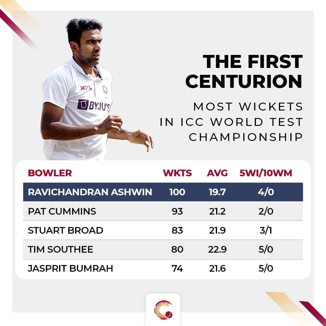 By adding two more wickets to his tally, Ashwin became the first bowler to bag 100 wickets in the ICC World Test Championships.