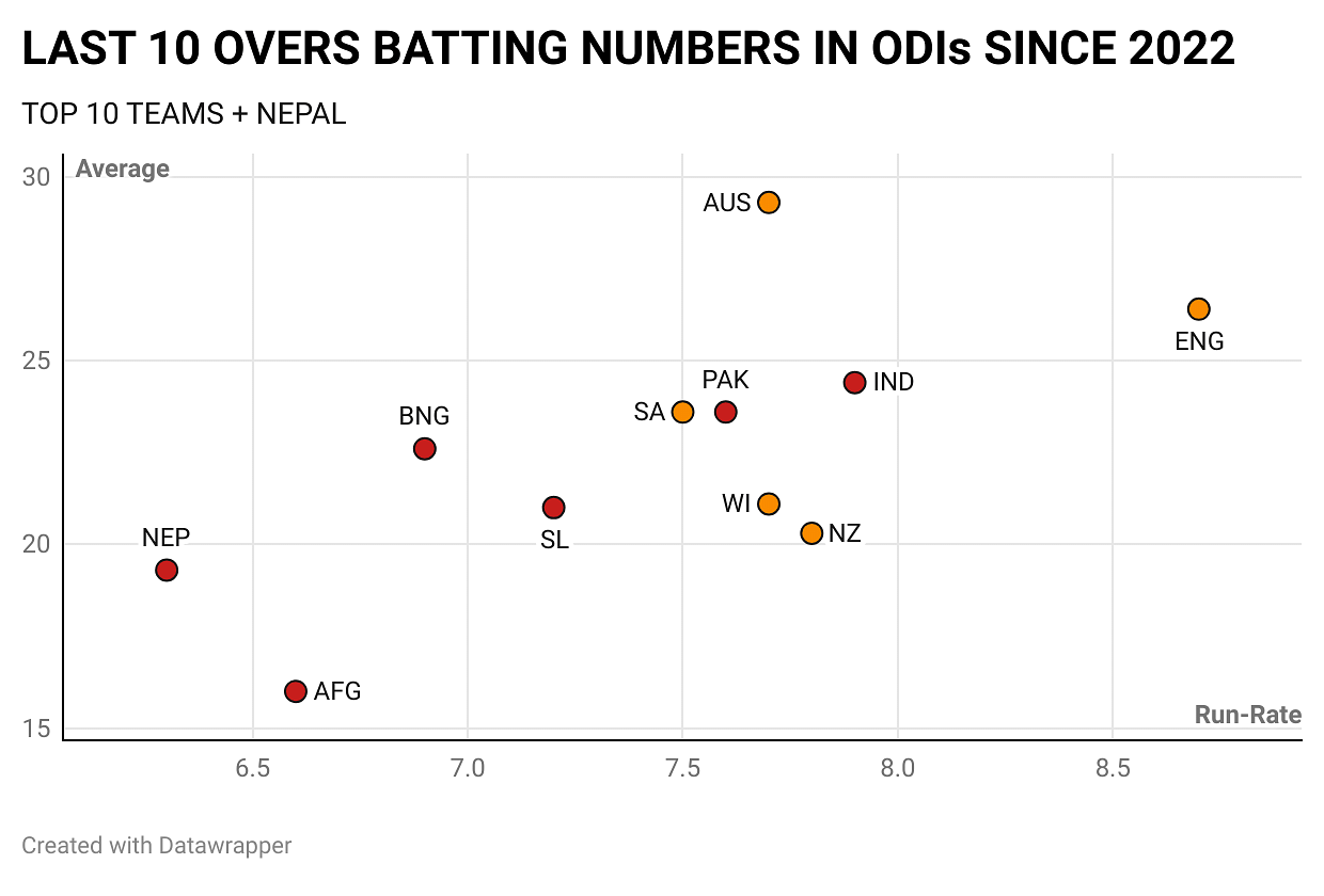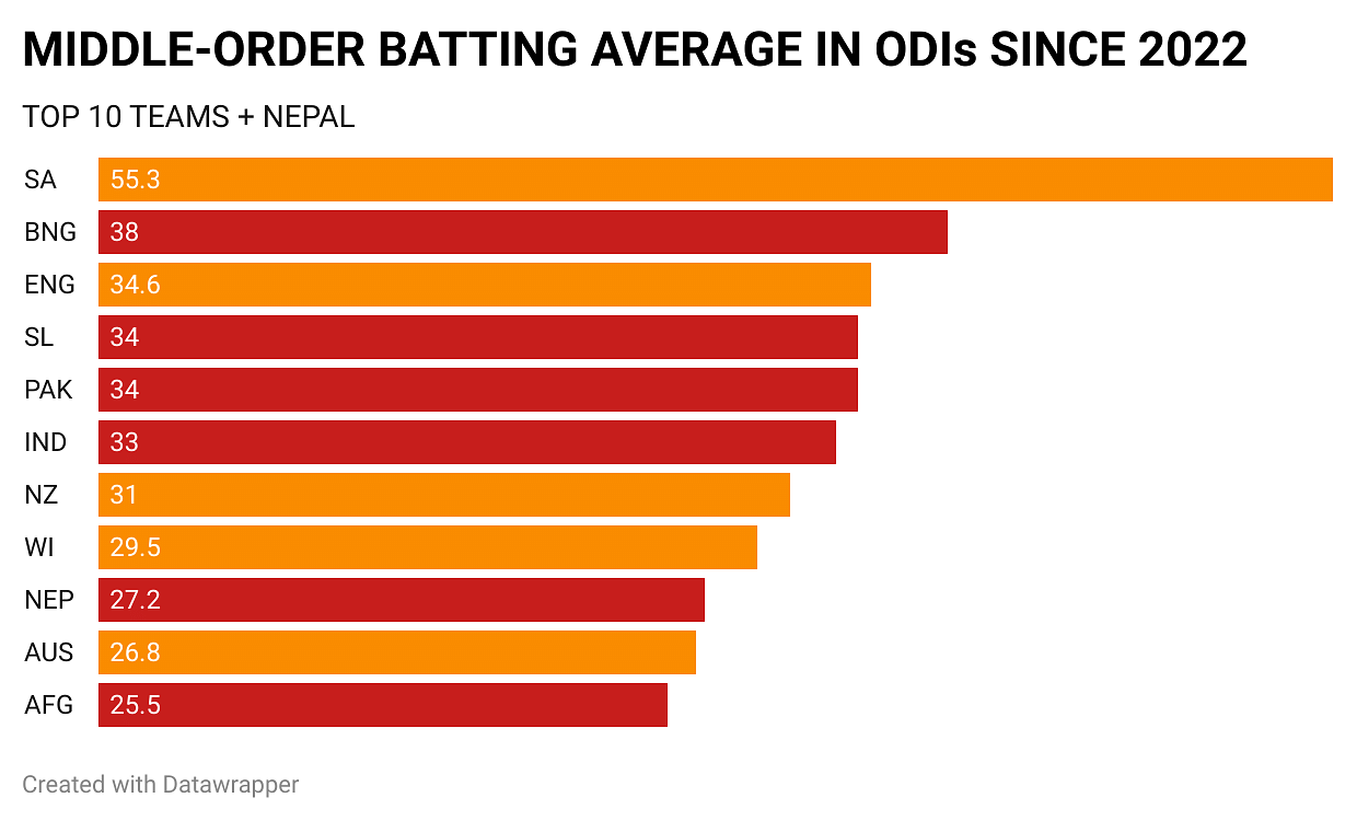 Afghanistan have a dodgy batting line-up and hence, the task of their top-order is cut out despite an impressive top-order average. Nepal are last on the list and don’t have any regular top order batter averaging even in mid 30s.