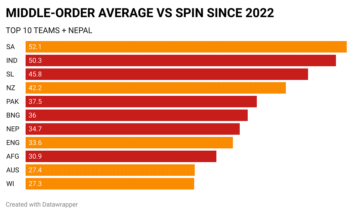 Meanwhile, Bangladesh average only 36 on this graph which is a good number in correlation with low batting returns on their home tracks against spin since 2022. They have consistently fared better against spin than their opponents series after series.