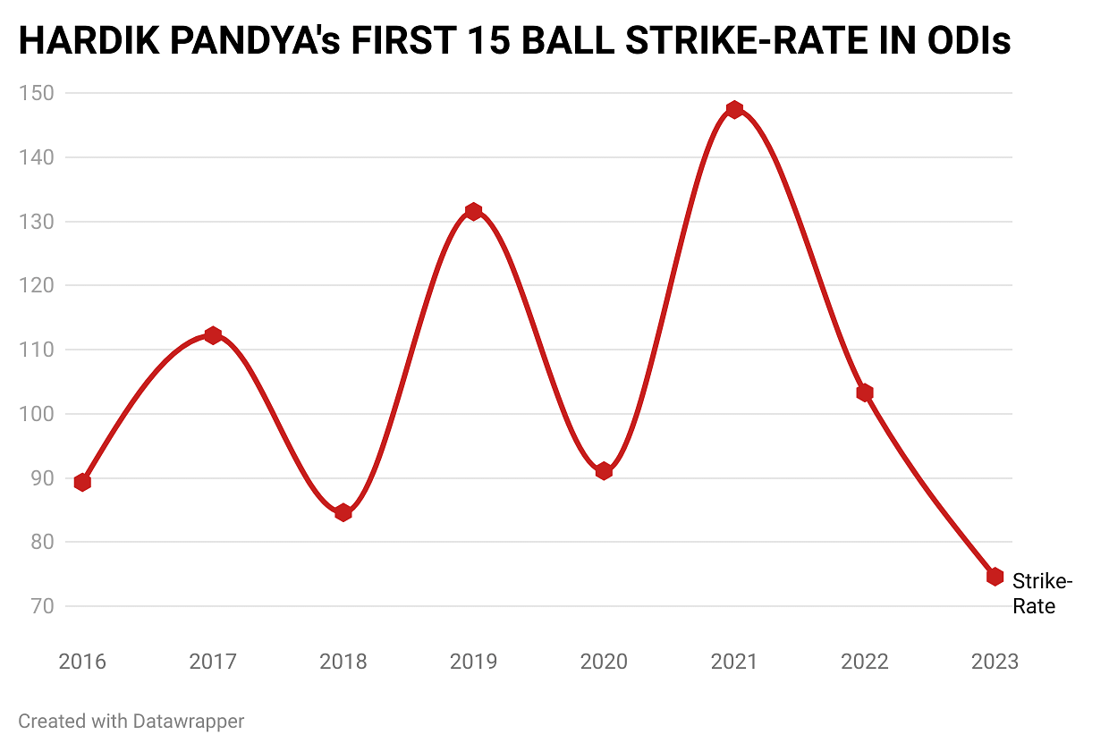 Pandya at six has turned himself into a grafter. His first 15 balls strike-rate in ODIs has dropped to 74.6 in 2023 as compared to 132.2 in 2021/22. That is a massive difference.