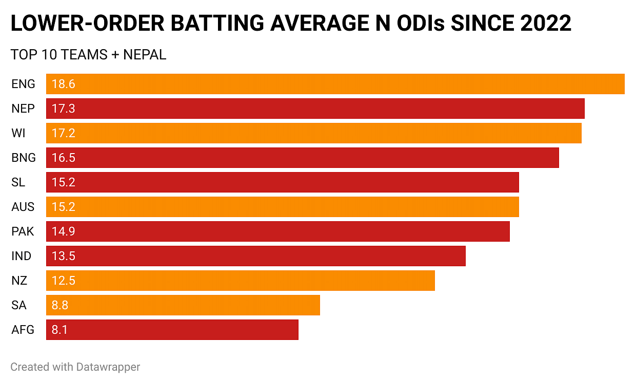 Bangladesh, Sri Lanka and India will rely on their number eight, beyond which their batting takes a nosedive. Bangladesh will have the best number eight batter in the competition to follow their strong middle-order. Mehidy Hasan has 350 runs batting at this spot since 2022, nearly 200 runs more than the next best. He averages 43.8 in this period with a hundred to his name.