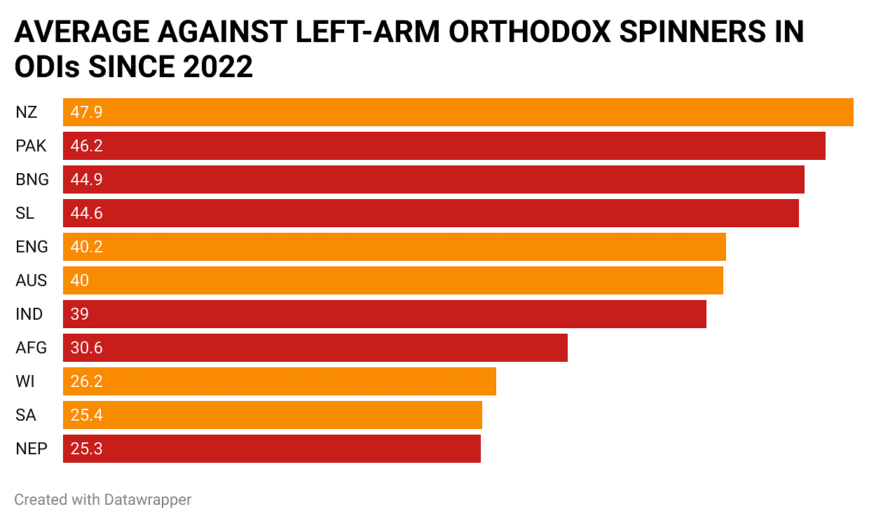 Bangladesh have the most ideal distribution of left-handers - Mohammad Naim in the top-order, Shakib in the middle and Afif Hossain in the lower middle-order. Inexplicably, they have the second lowest average for left-handers in ODIs since 2022 - 26.1. If they get over that grim number, Bangladesh are well placed to maximize the LHB-RHB dynamics in their favor.