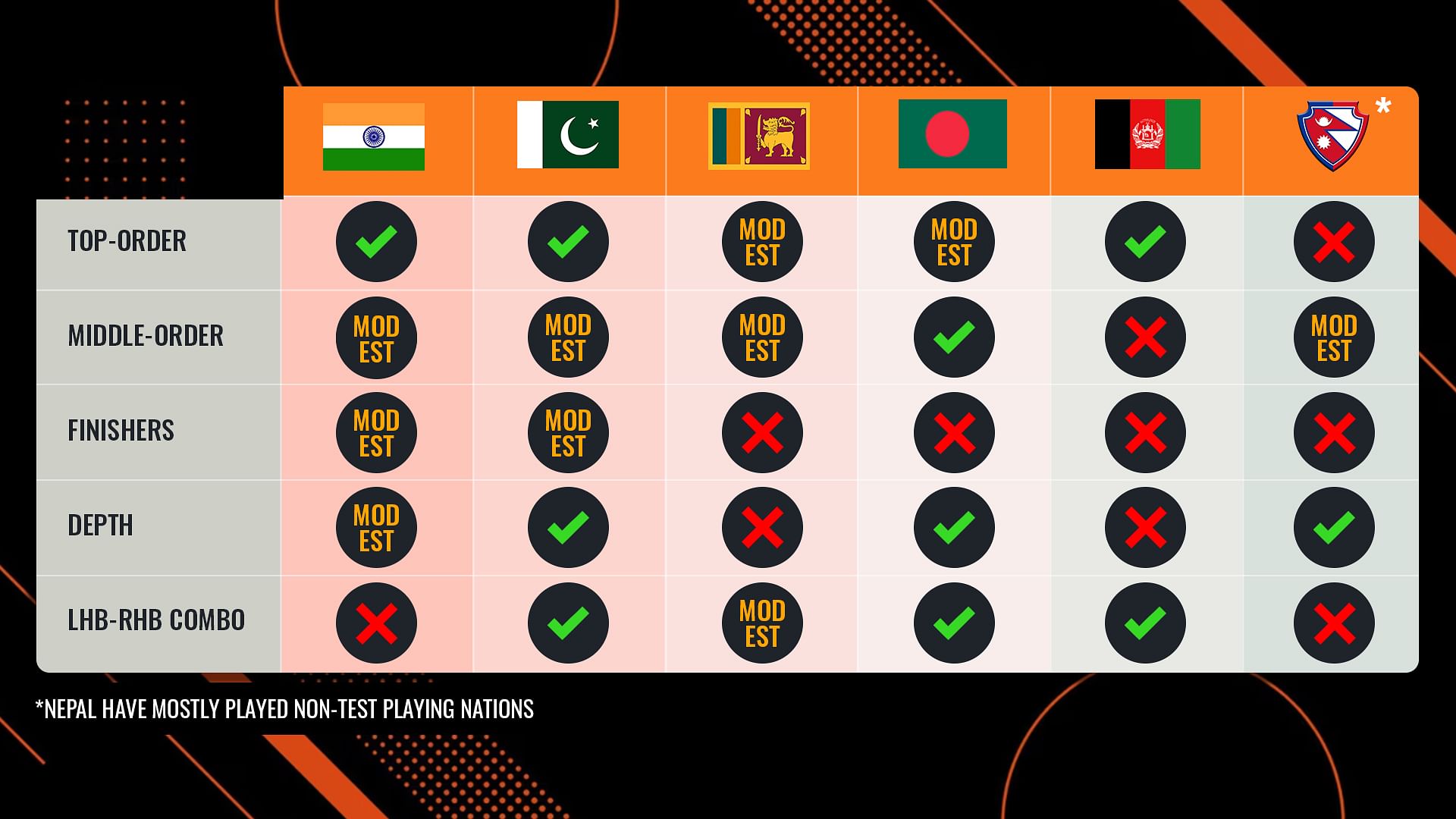 No team has all bases covered. Pakistan and Bangladesh tick most boxes. Sri Lanka don’t tick any. India have limitations in every department, getting a moderate rating in most facets but remain the title contenders in this competition. Afghanistan have poor numbers, barring their top order. Nepal have shown progress but the other teams are simply better with more experience.
