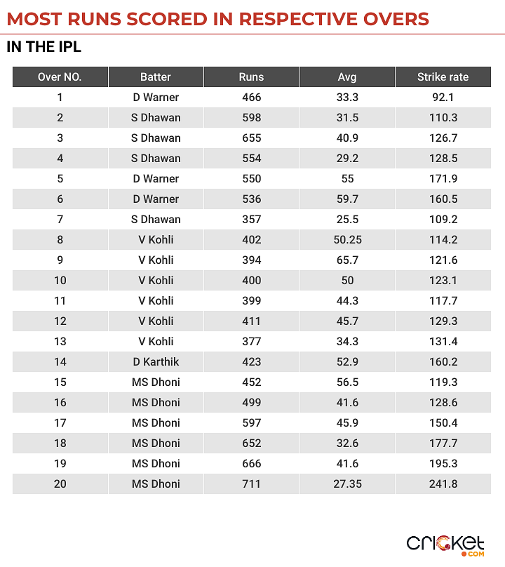Second question: Here is a list of the most runs scored by batters in respective overs in the IPL.
