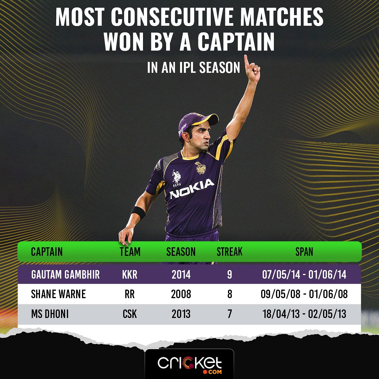 First question: In the 2014 IPL season, under the captaincy of Gautam Gambhir, Kolkata Knight Riders won nine consecutive matches, including the final. This is the longest streak for a captain in an IPL season. Shane Warne, in 2008, had won eight successive games, the second-longest streak. MS Dhoni won seven consecutive games in 2013.