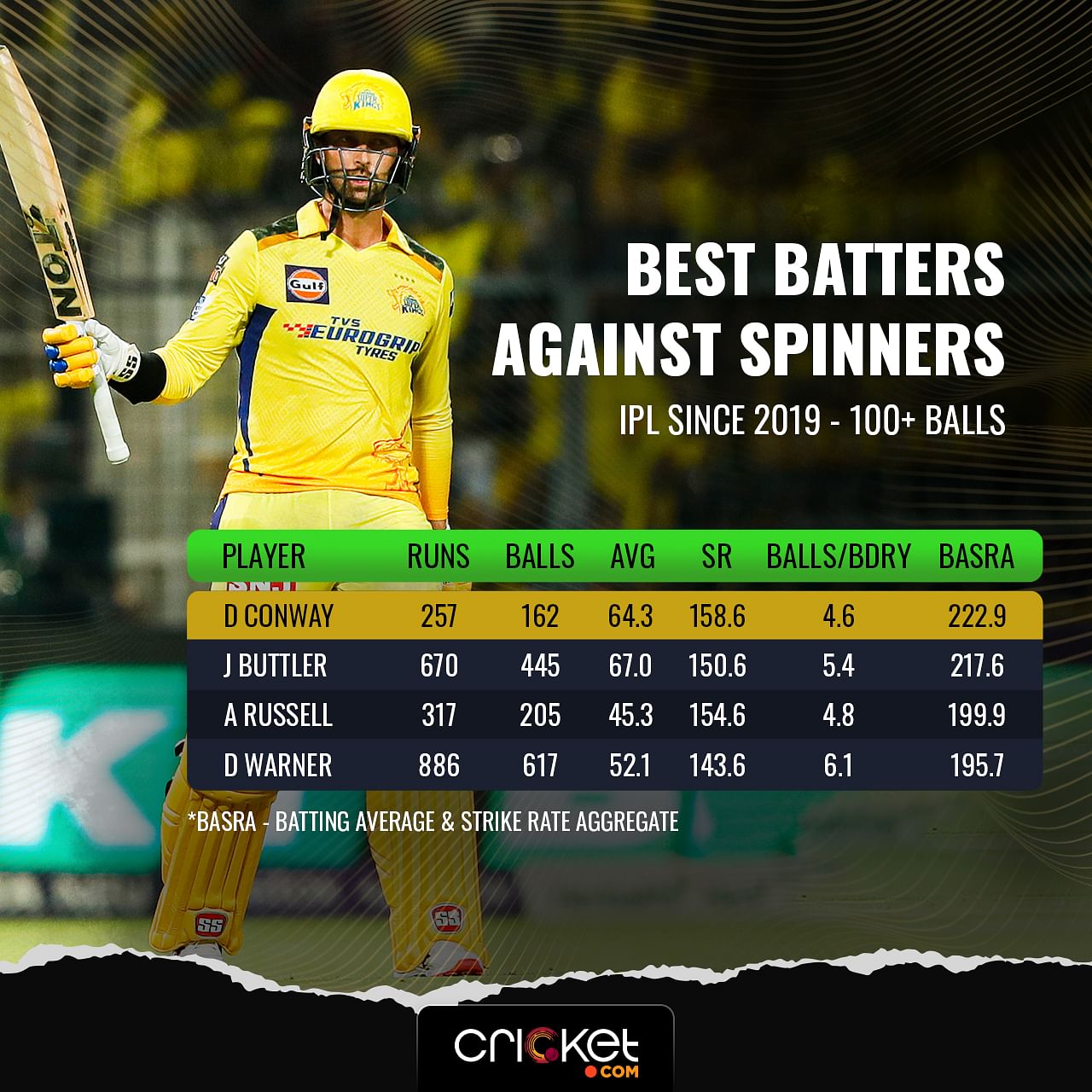 Among the four, Devon Conway has the best BASRA (batting average and batting strike rate aggregate). He has an average of 64.3 and a strike rate of 158.6, adding up to a BASRA of 222.9. He has hit a boundary every 4.6 balls against tweakers, which is also the best among the lot.