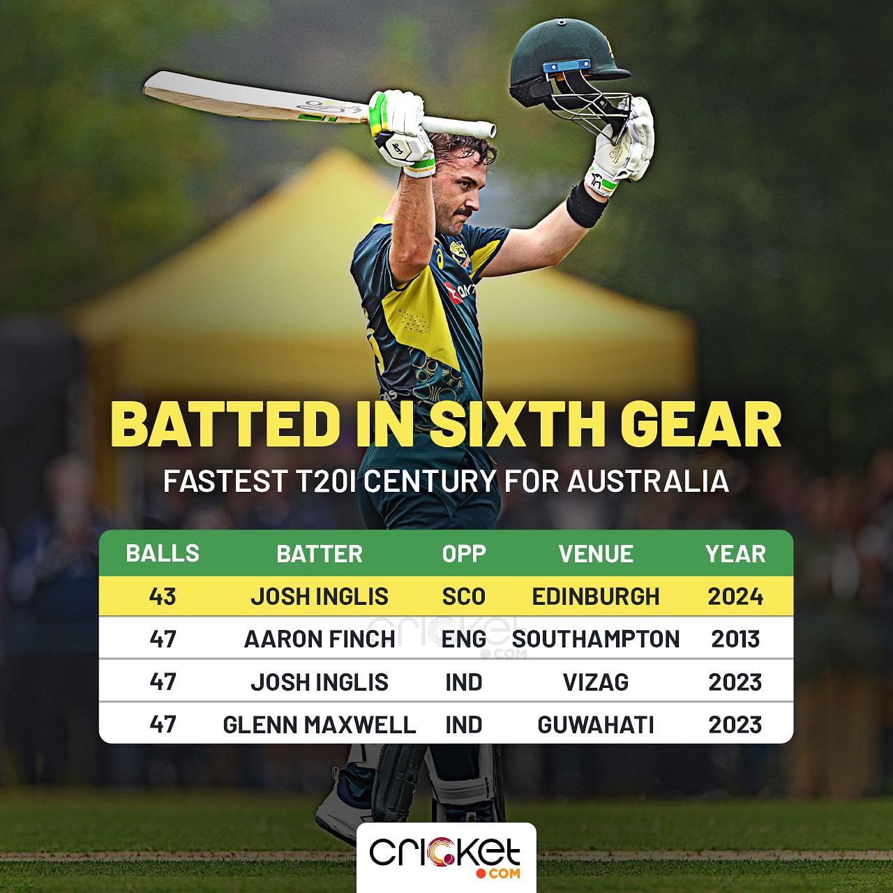 Inglis, who also smashed the second-fastest fifty (20 balls) in Edinburgh before going on to convert into a hundred, became the first wicketkeeper-batter from Australia to score a T20I century. Inglis had scored a century against India in late 2023, but he was not the designated wicketkeeper for that game. Matthew Wade, the captain of the team on the tour, kept wickets.