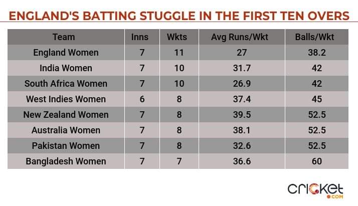 In the seven innings, England have lost 11 wickets in the first 10 overs of the innings, with balls per wicket ratio of 38.2, the worst among all the teams.