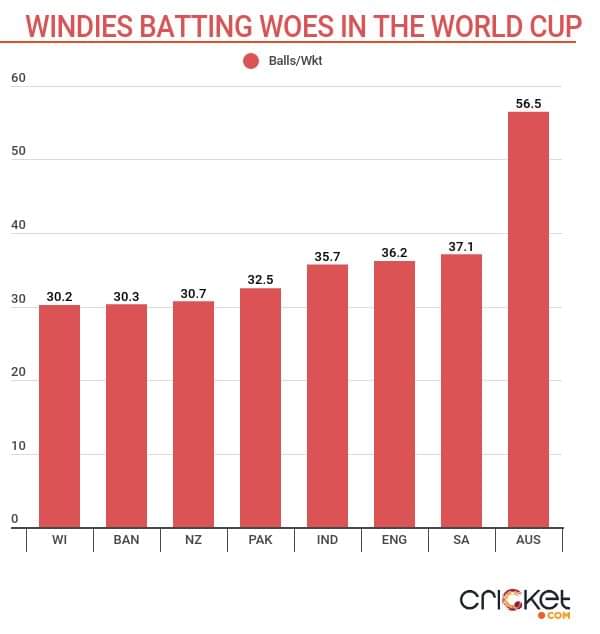 In the course of the tournament, the Windies have struggled with the bat and failed to stitch any partnerships, especially in the second half of the league stage. West Indies have lost a wicket every 30.2 deliveries, the worst among all the teams in the competition.