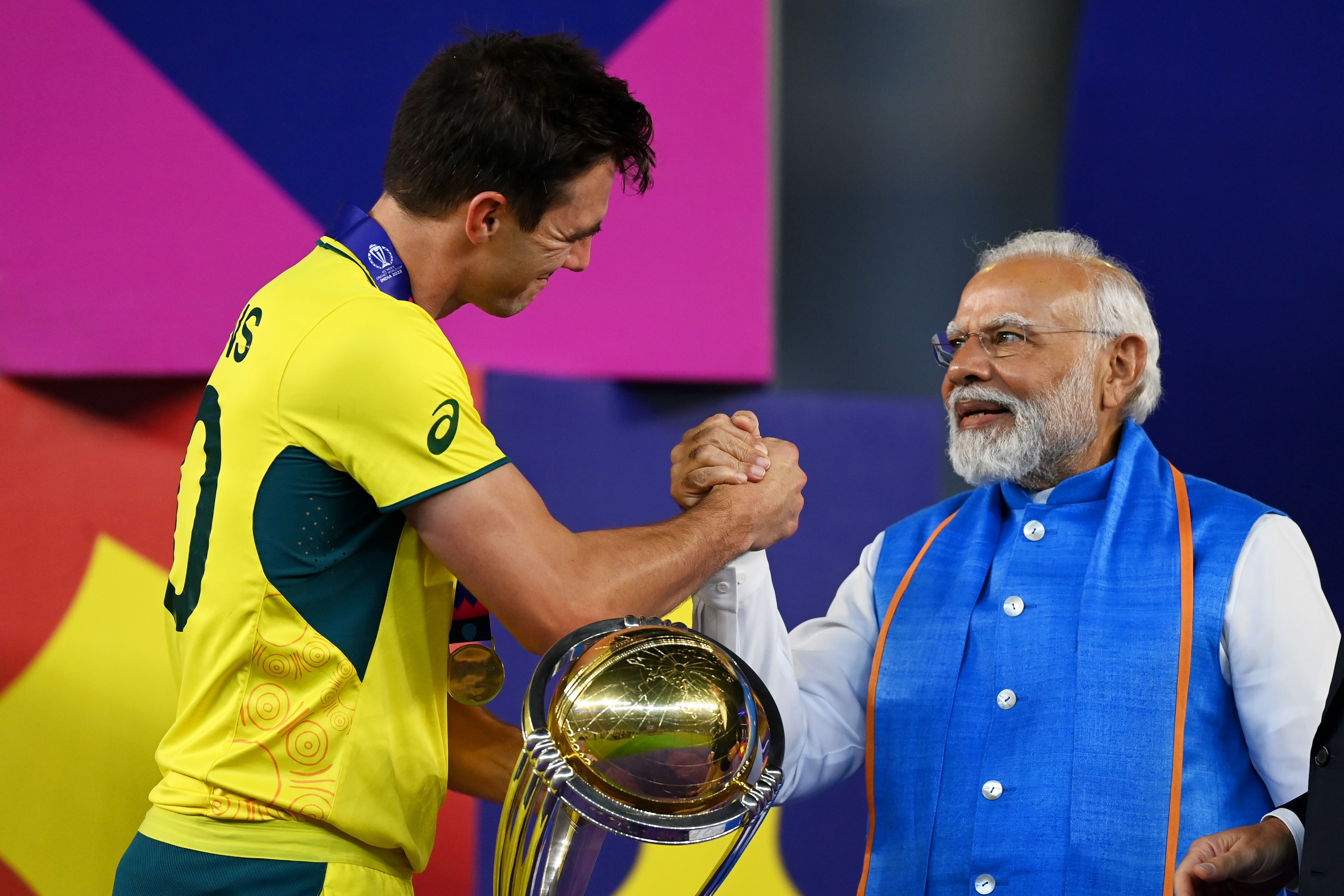 I can see Pat Cummins taking the trophy from PM Modi. He has a medal around his neck.