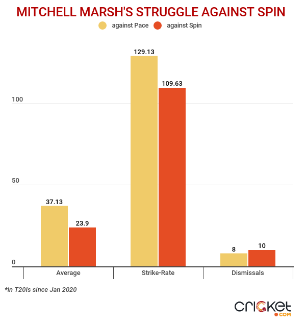 However, with most of the sides being aware of his weakness – spin bowling - which they have used extensively to trap him. The right-hander against spin, averages 23.9, at a strike-rate of 109.6, with 10 dismissals in the last 18 innings, that’s 55% of his dismissals. Unlike pace, against spin, Marsh only strikes a boundary every 8.7 deliveries.