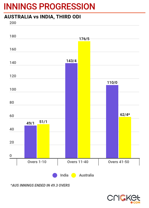 This was a phase of five overs when Maxwell changed the complexion of the game. From overs to 40-44, Australia scored 51 runs and brought the asking rate down to about run-a-ball.