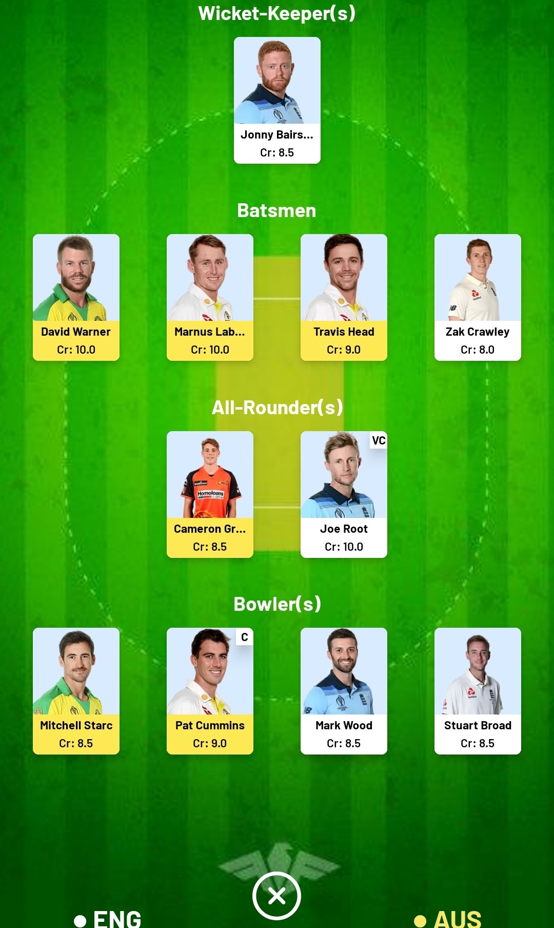 Australia: David Warner, Usman Khawaja, Marnus Labuschagne, Steve Smith, Travis Head, Cameron Green, Alex Carey (wk), Pat Cummins (c), Mitchell Starc, Nathan Lyon, Scott Boland