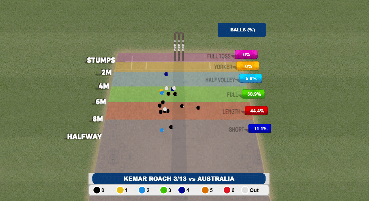 Roach’s first impact was with the bat when he played out 40 balls, scoring eight runs and putting on a show with Sinclair. But with the new ball in hand, Roach spelt trouble and put Australia in a position they hadn’t been in for quite a while. In that first spell, Roach targeted Steve Smith's and Cameron Green's weaknesses.