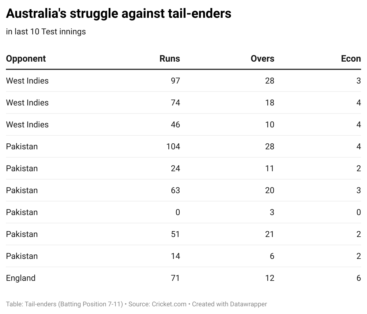 From batting positions (8-11), Australian bowlers conceded 97 runs at a pace of 3.44 RPO. It wasn’t even the first time they conceded runs at such a pace against the tail, with West Indies only scoring 74 and 46 in the previous Test in Adelaide, where the runs were flowing at a rate of 4 and 4.5.