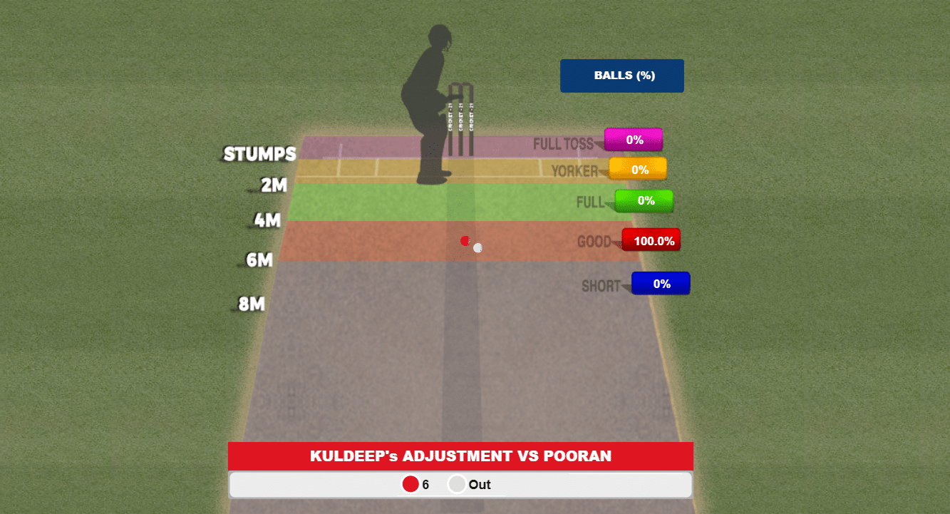 While the line of the ball that got hit for a six was on middle, Kuldeep bowled this particular delivery wider. This one pitched marginally outside off. He also pulled the length back ever so slightly. A combination of the two was enough to fox Pooran, who went ahead with the big heave anyway and paid the price.