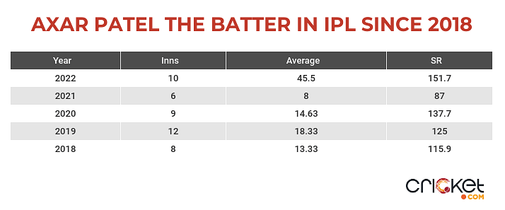 The glass-half-empty way of seeing things is that Axar, all through his career, has been an average-at-best T20 batter who has merely played a handful of impactful knocks, a good chunk of them coming in IPL 2022.