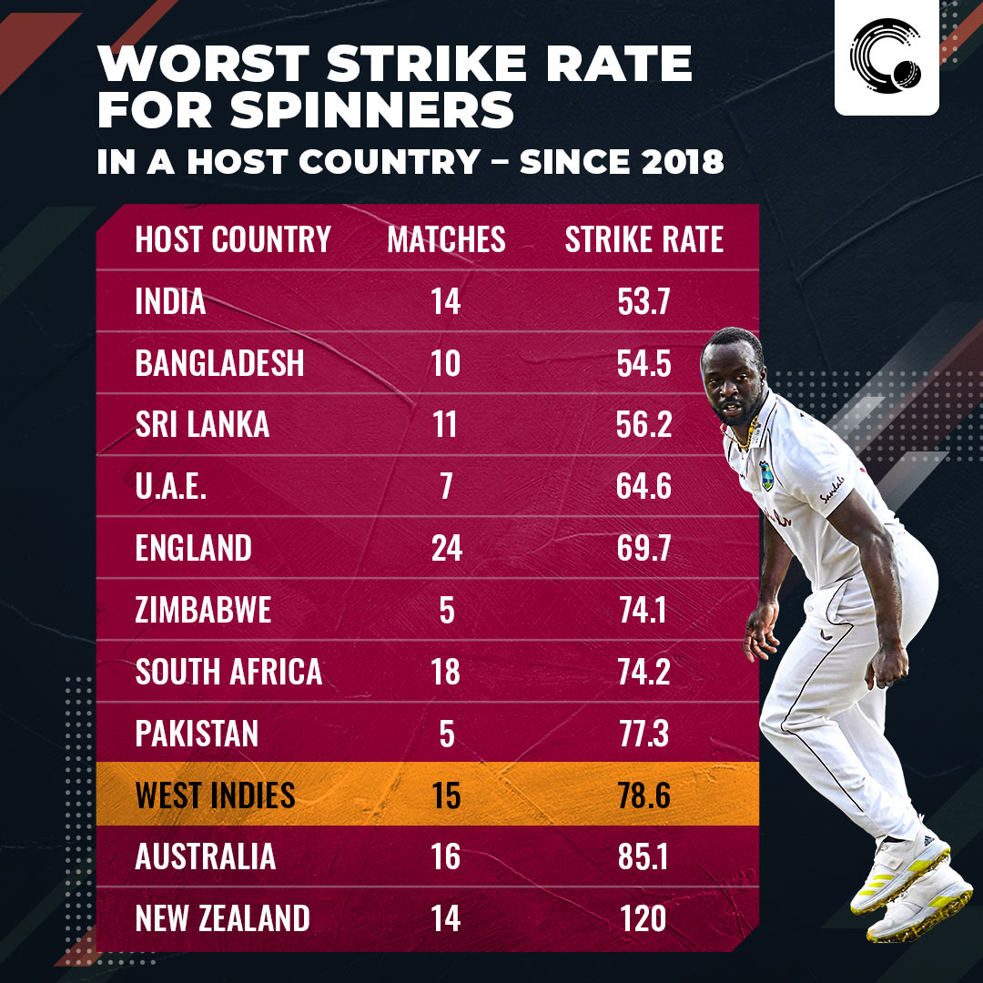 Spin isn't certainly West Indies' cup of teaHowever, there is a catch, a mighty one, in the last five innings at Kingston, spinners have only bagged four wickets, with it all coming in 2019, against Bangladesh. Since 2018, the strike rate for spinners in West Indies has been 78.6, ranks ninth out of the eleven Test playing nations.