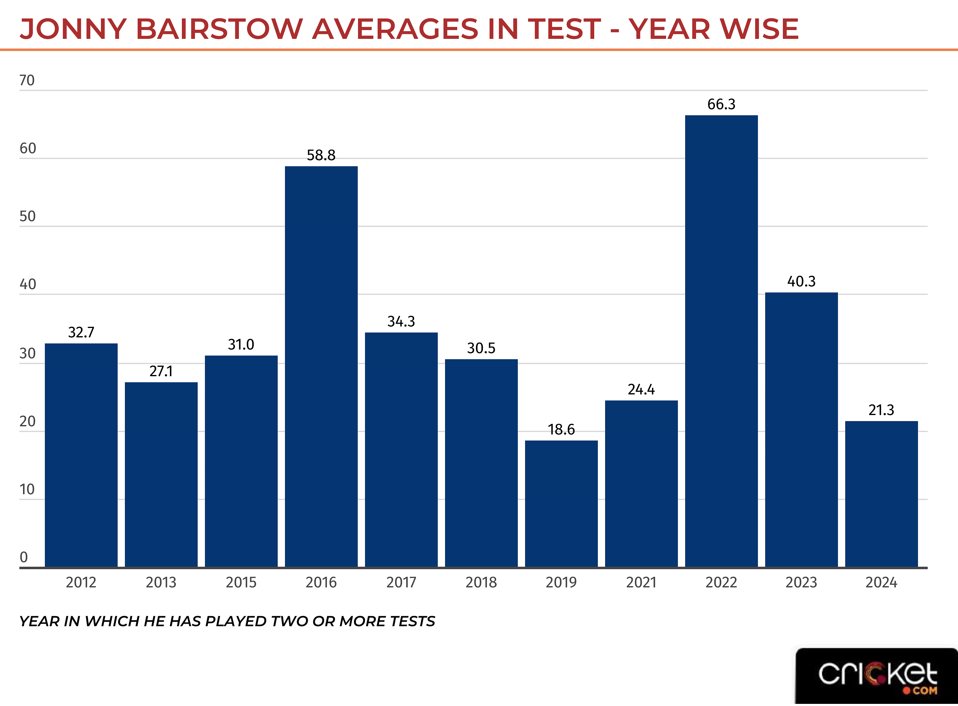 His best tenure has been under the captaincy of Stokes. Even in the ongoing series against India, Bairstow might be averaging only 21, but he has thrown away a few starts that he got.