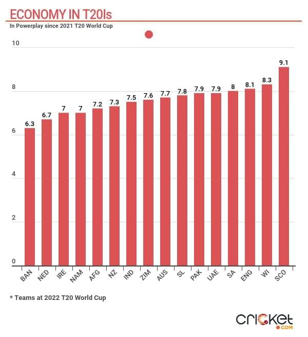 Among the teams that have qualified for the 2022 edition, Bangladesh have been second worst while batting in the powerplay with an average run rate of 7.1. Only UAE and Pakistan are marginally below them at 7, but both the teams compensate for it in the middle overs 7.4 and 7.8 respectively. Bangladesh, meanwhile, remain stagnant at 7.1.