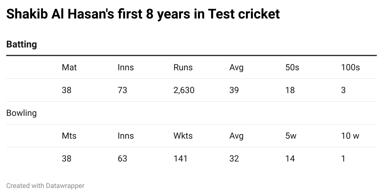 After exactly eight years of his Test career, Shakib had taken 141 wickets and scored 2630 runs. His batting average was 39 and his bowling average 32, making it a difference of +7, which is the gold standard for a batting all-rounder, which Shakib was. He mostly batted at number five and six and very rarely at seven.