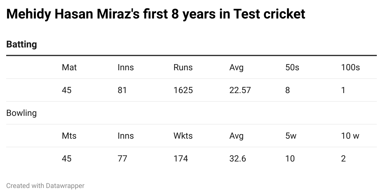 Mehidy, on the other hand, has played 45 Tests a month away from his 8th anniversary in Test cricket. He has scored 1625 runs at an average of 22.57 and taken 174 wickets at an average of 32.6, which is excellent for an off-spinner. He has two 10-wicket hauls and 10 five-wicket hauls to his name.