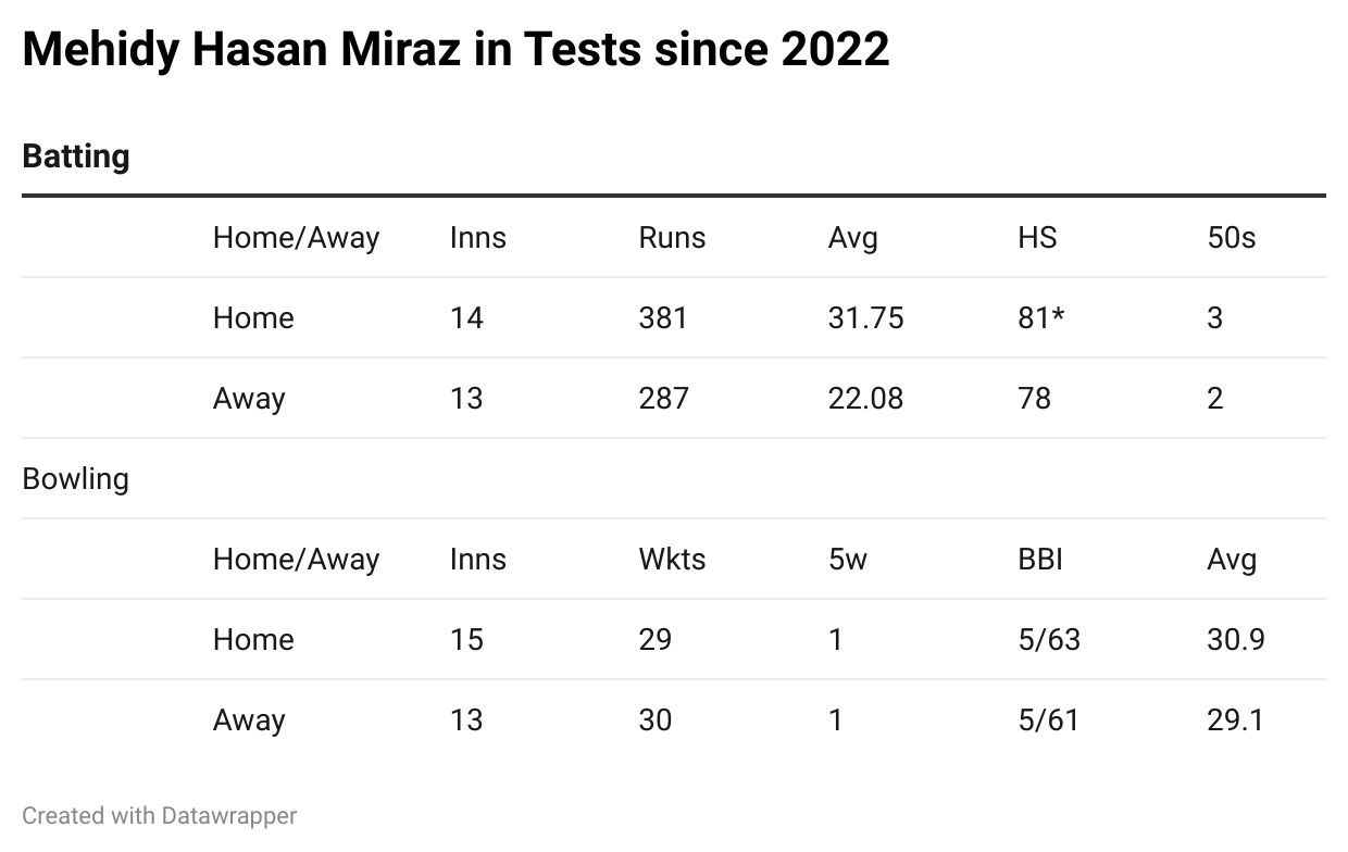 With the bat, the 26-year-old has scored 668 runs at an average of 26.72, which is a significant upgrade on his career average of 22.57. Away from home, with the bat, too, Mehidy has been able to hit two fifties.