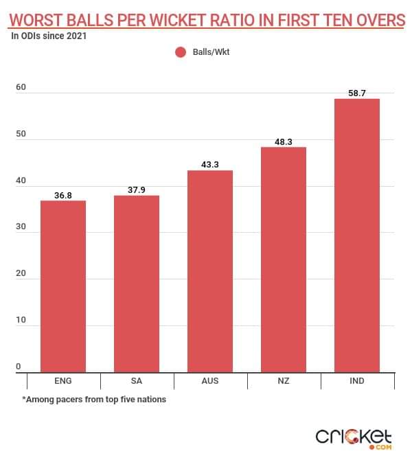 In the 17 innings since 2021, the Indian fast bowlers have managed to scalp 14 wickets in the first ten overs at a ball per wicket ratio of 58.7, which is the worst among the top five nations. Among those 14 wickets, the 39-year old has picked up eight wickets.
