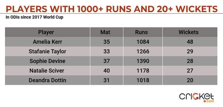 With Amy Satterthwaite taking maternity leave, Kerr was the key at number three. In the 35 matches played thus far, she has scored 1084 runs and scalped 48 wickets, which is the most among players with a minimum of 1000 runs and 20 wickets since the 2017 World Cup.