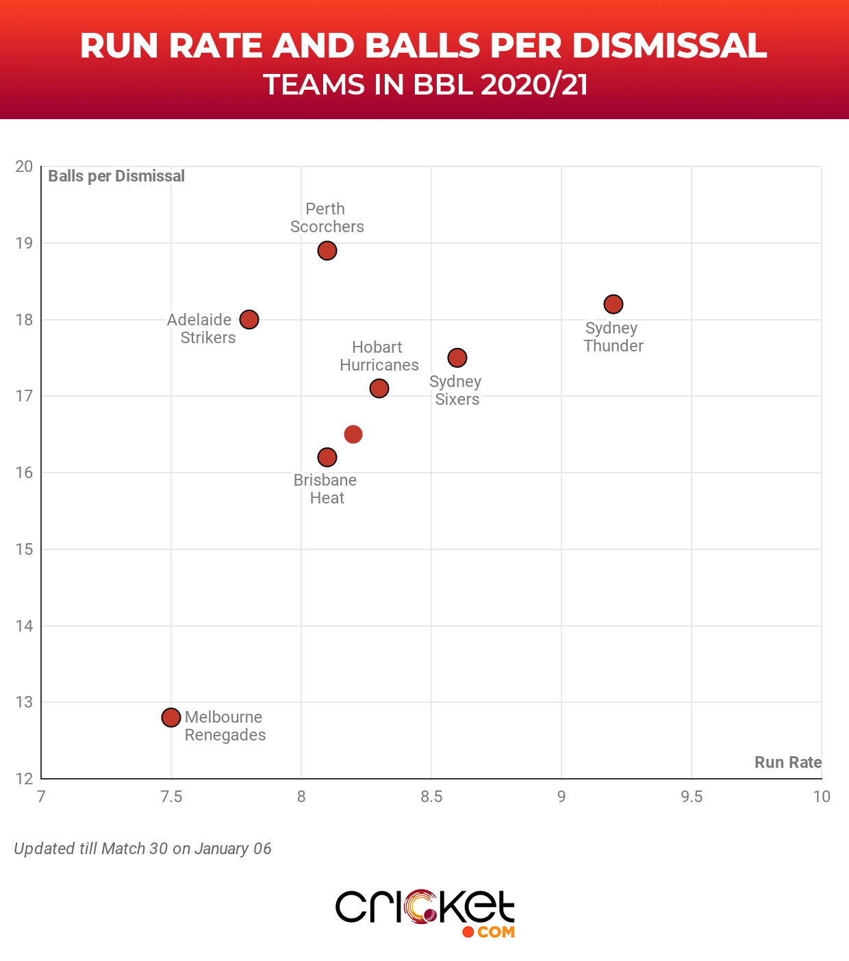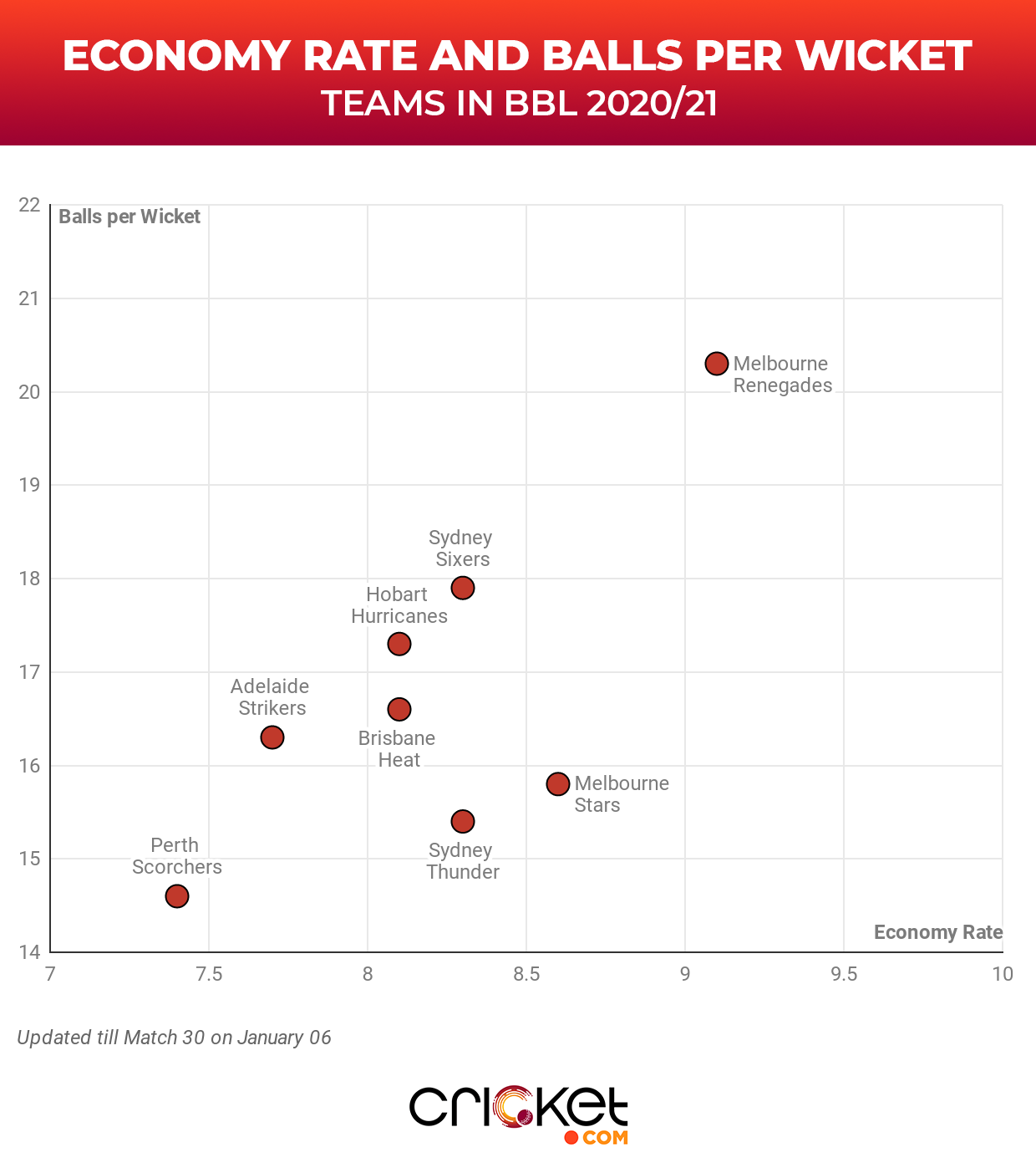 Always a good bowling side, there is no surprise that the Scorchers are best bowling unit after 30 matches in the league stage - best economy, bowling average and strike-rate by a distance. Jhye Richardson has picked three three-wicket hauls, the most by any bowler thus far. Marsh has also started bowling which is a big boost to their campaign.