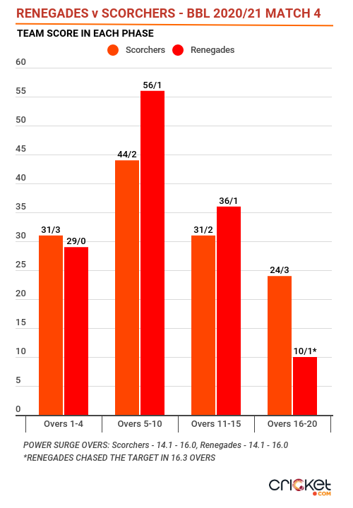 A testament to the abject failure of Scorchers' batsmen on the night is the fact that they lost one wicket each in ten overs. Implying that the restless batsmen did not show patience to stitch a partnership. A phase of four and three overs without a wicket came during the small partnerships for the fourth and eighth wicket respectively.