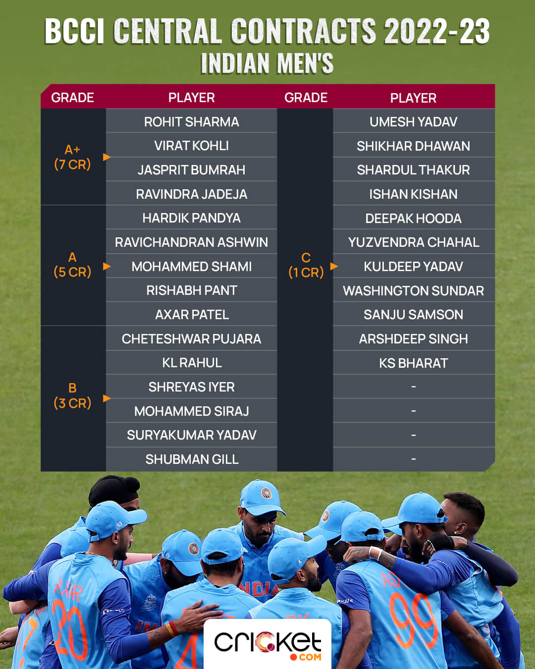 On Sunday (March 26), the Board of Control for Cricket in India (BCCI) announced the retainer contracts for the Indian Men's players for the period between October 2022 to September 2023, grading the players into four categories. While A+ Grade players will take home a sum of 7 Crore each, the Grade C players will earn 1 Cr for their services.