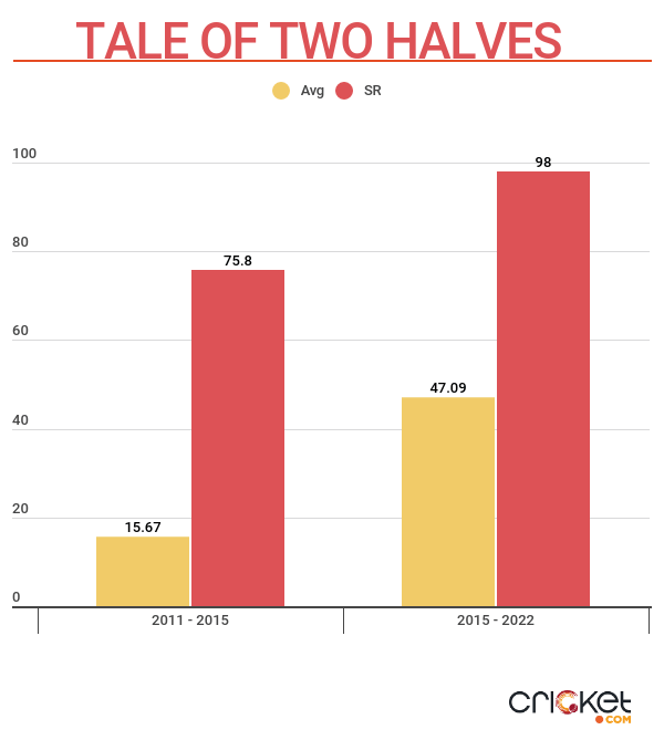 However, the all-arounder bounced back after the World Cup snub and amassed 2637 runs at an average of 47.09 since then to emerge as one of the mainstays in the middle order of the national side.